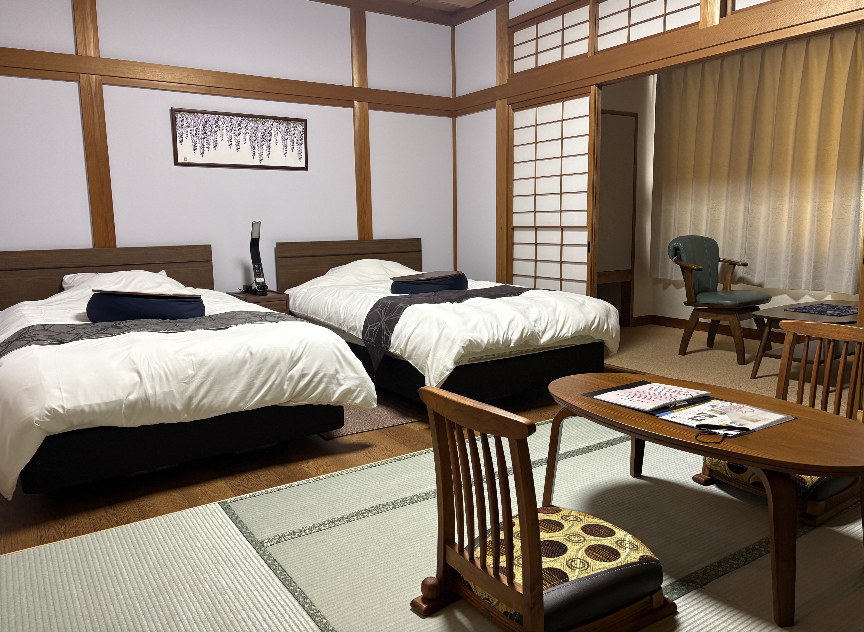 中央館「ふじ」の間 和洋室に改装しました!! シモンズのセミダブルベッドを2台、冬場はこたつも用意いたします。ぜひご利用くださいませ!!